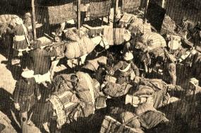 Camping Equipment Pandemonium as usual in a Central Asian caravanserai, as photographed by famed Swedish Long Rider, Sven Hedin, in the late 19th Century. |