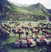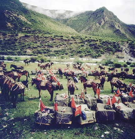 When the group passed through Deqen, Slow and I joined in with the Pu-ur Tea Company’s caravan of ninety-nine mules, all of which carried the green tea loaded in wooden cradles on their backs. I walked beside Slow in line with the group, for twenty miles a day, for sixty-five days, until we reached Lhasa in Tibet.