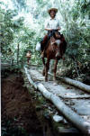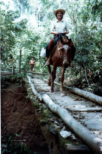 | Evelyne crossing a small river in the Amazon. "The most dangerous situation I encountered was during the journey in the Amazon with my husband. The underfed horses were too weak to continue. We left them with some missionaries and continued on foot, with the luggage, in the heart of the forest. Fréderic caught malaria and was delirious. I didn’t think I could get him out of there alive." |
