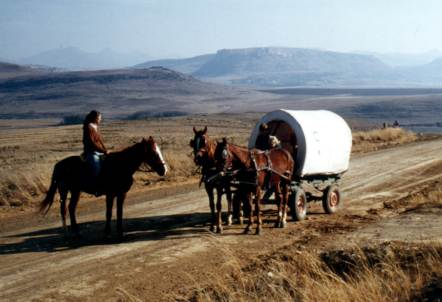 | After her daughter was born, Evelyne and her the family explored South Africa with the father and children in a wagon and Evelyne in the saddle. |