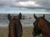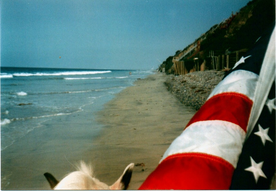 ![]() American Long Rider Ron Villareale arrives on the Pacific Coast on his mare, Thunder, after his ride across the USA in 1985. |