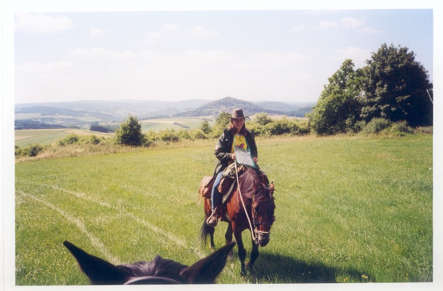 ![]() European Long Rider Basha O'Reilly and her stallion, Count Pompeii, rode from Russia to England in 1995 |