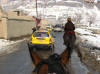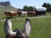 ![]() North American Long Rider Colleen Hamer's horse looks at ox-drawn wagon at Scottsbluff Monument in Nebraska in 2011 |