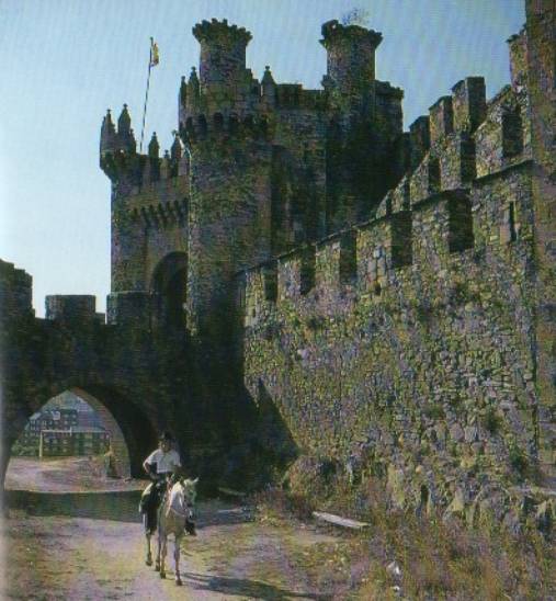 Equestrian traveller Louella Hanbury-Tenison riding under the walls of the Templar castle at Ponferrada. |