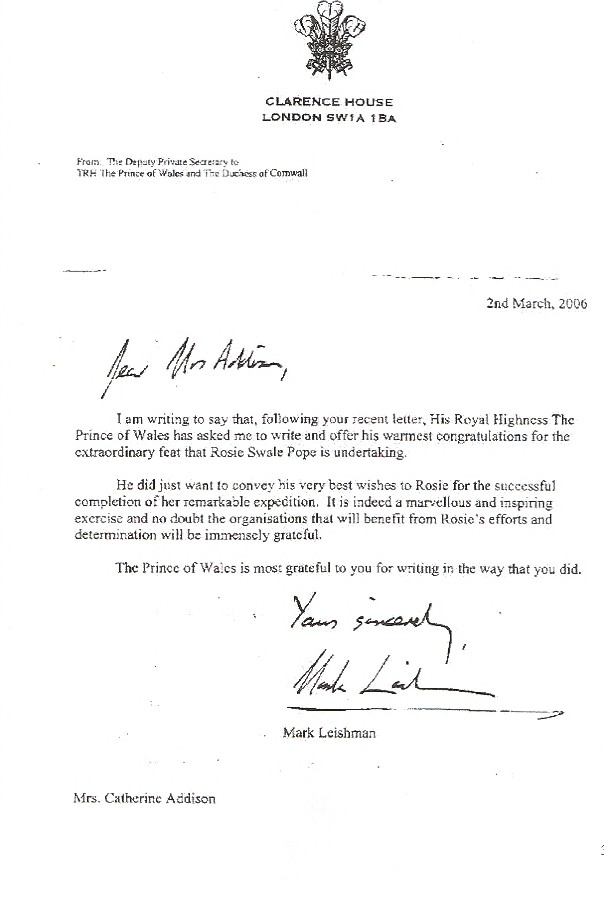 "I am writing to say that, following your recent letter, His Royal Highness The Prince of Wales has asked me to write and offer his warmest congratulations for the extraordinary feat that Rosie Swale Pope is undertaking. He did just want to convey his very best wishes to Rosie for the successful completion of her remarkable expedition. It is indeed a marvellous and inspiring exercise and no doubt the organisations that will benefit from Rosie's efforts and determination will be immensely grateful. The Prince of Wales is most grateful to you for writing in the way that you did." |