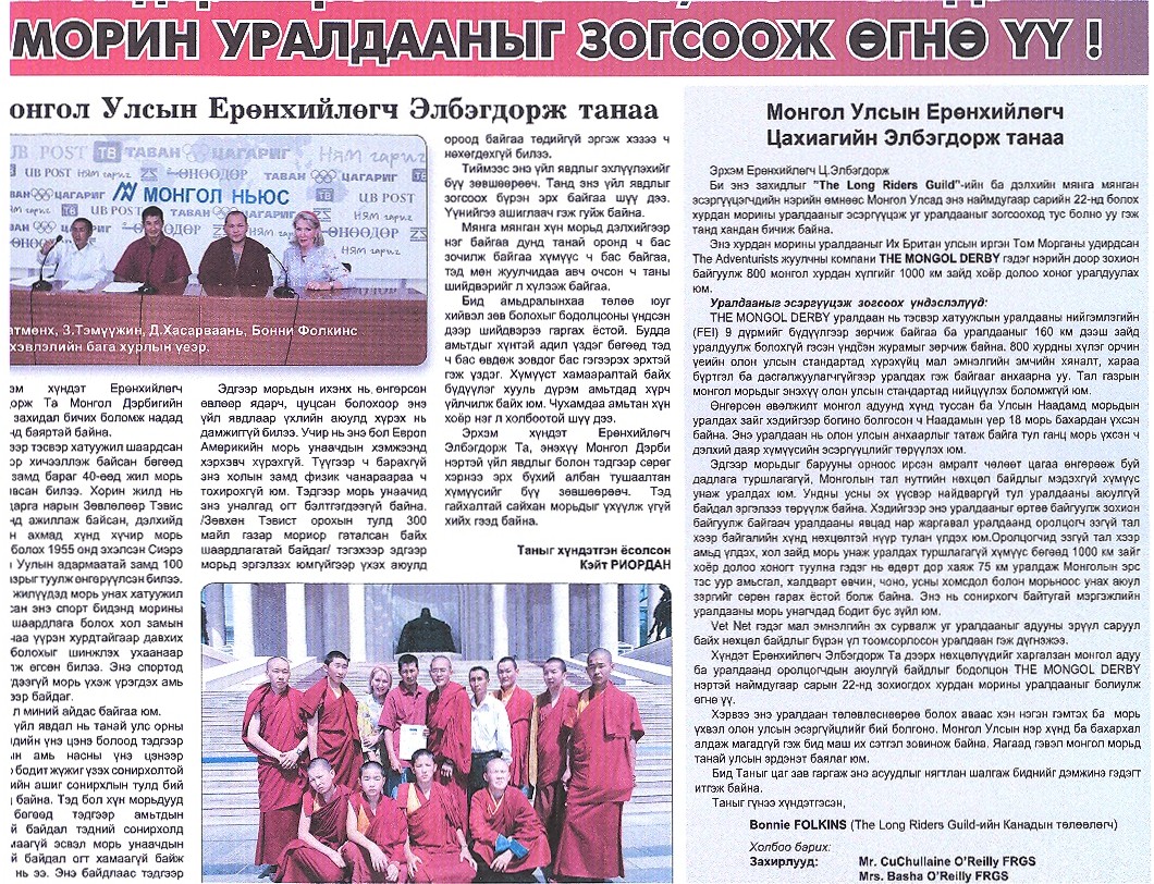 | Mongolia Today newspaper reports on the Press Conference held by Long Riders Temuujin Zemuun, Batmonkh Muntuush and Bonnie Folkins. Pictured also is the delivery of the international petition to the President by the Long Riders and Buddhist monks. |