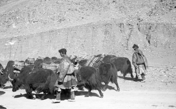 This vast caravan moved in a kind of multi-species leapfrog, day after day, as they crawled slowly deeper into the Himalayas. First went the yaks with their burdens, setting forth at midnight and grazing along the way. (Everyone else caught up to them before reaching the next campsite.) About two o'clock in the morning, the rest of the caravan began to prepare to move. The horses were saddled and the pack animals--mules and horses--were loaded . . . while Norbu usually lay snug in his tent, unable to force himself out into the icy pre-dawn wind till the very last moment. Then he hurried out and saddled his horse, while a companion struck his tent and loaded it on a mule. All this happened by whatever feeble starlight or moonlight the weather might offer.