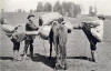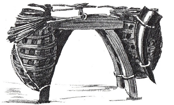 Meanwhile, as the Occident experimented with ropes and pads, an entirely different pack saddle system developed in the Orient. The girthless Oriental pack saddle consists of four main components. One, a thick pad rests atop the pack animal’s back. Two, on top of the pad sits two thick wooden arches, which are kept in place by four strong wooden slats. Three, a lighter wooden frame-work is designed to fit snugly inside the larger wooden arches. Four, attached to this frame-work are two sturdy baskets designed to carry the load.