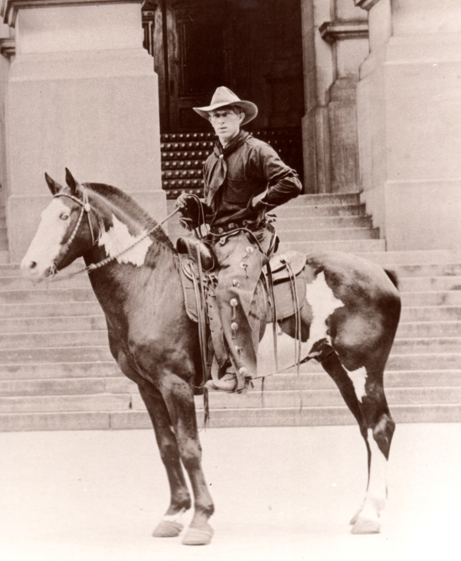 | Only one horse, a tough 15 hand, 900 pound Morab gelding named Pinto made the entire trip. This photo shows George Beck and Pinto at the Georgia state capital on June 5th, 1913. | |