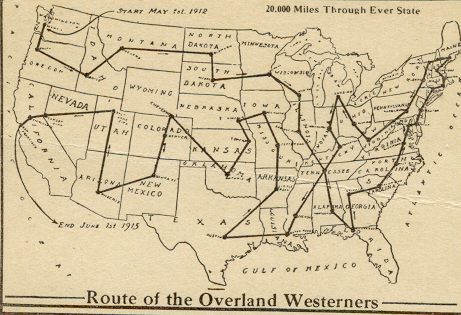| To reach all 48 state capitals, the Overland Westerners followed this route. They started in Shelton, Washington on May 1, 1912 and arrived at San Francisco, California on June 1, 1915. |