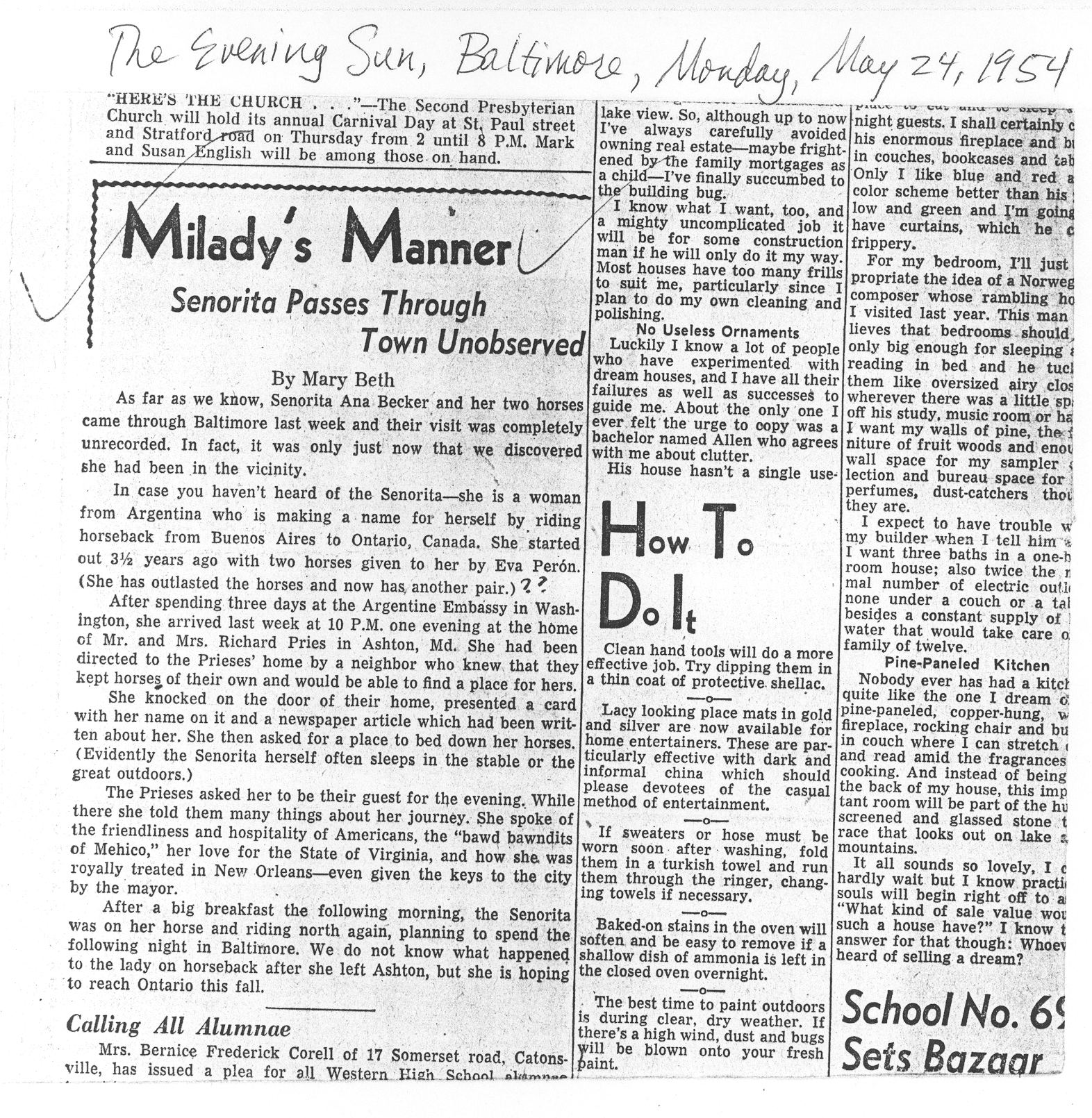 Attached are some files scanned from newspaper clippings from the Evening Sun (Baltimore) and Washington Post newspapers, which my parents saved all these years, along with a copy of her calling card. The “Mr. and Mrs. Richard Pries” referred to in the article titled “Milady’s Manner: Senorita Passes Through Town Unobserved” (in which Ana Beker’s name is misspelled Becker) are my parents. |