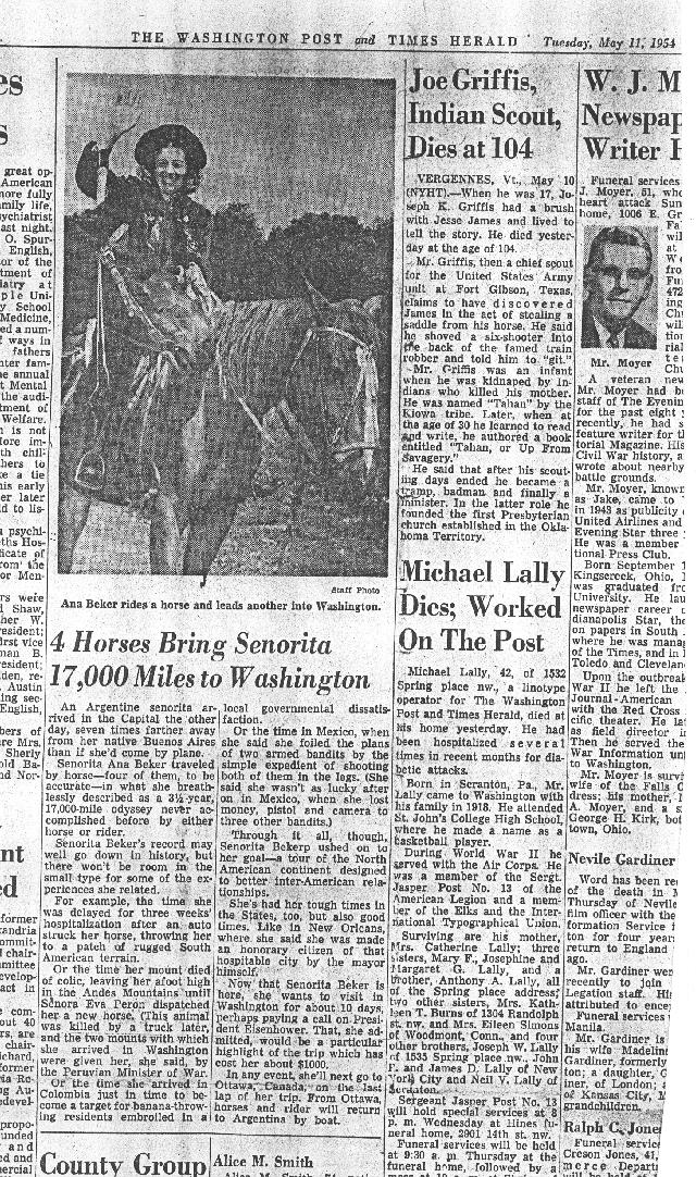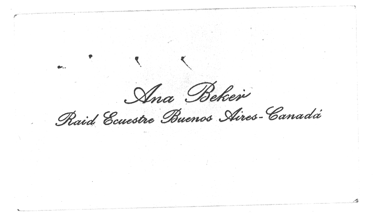 Ana Beker said that she was on her way from Argentina to Canada to visit a friend, and that the first two horses with which she had started the trip had been given to her by Eva Perón. She had been riding for about three years in that endeavor and had had all sorts of adventures. She had fought off banditos in Mexico, defending herself with her pistol. But at some point they, or some other banditos, came back and stole her pistol and (my mother thinks) also one of her horses. She felt quite vulnerable until she was able to obtain another pistol. But Ana said that when she stopped at the famous King Ranch in Texas, they outfitted her and replaced the horse that was stolen, and maybe the pistol as well.
