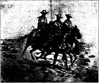 Off to the left a good road wound its way up to the Roosevelt Dam and, as I watched, three objects appeared in the distance and gradually took the shape of horses and their riders. Down the stretch they came on a gallop. It was plain they were racing for some given point. As they drew nearer they seemed to be heading straight for me, so I wasn't exactly surprised when three horses were pulled up so suddenly that they almost sat on their haunches, and three Stetsons were doffed as with a jolly laugh their owners chorused: "Mornin' Wyomin’, -yuh goin Tucson way?"