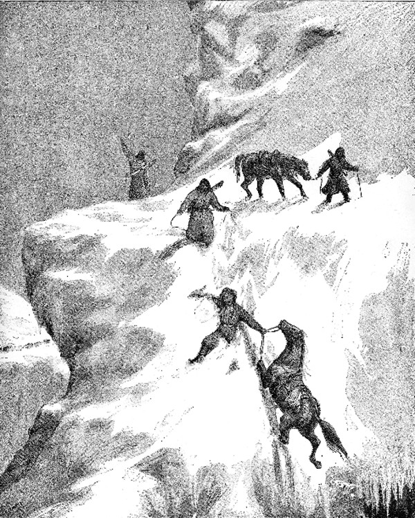 | During his astounding journey “through the heart of Asia”, Gabriel Bonvalot’s courage and resistance overcame all obstacles. On one occasion, as the illustration demonstrates, Bonvalot’s horse stumbled and nearly went hurtling over a 300 foot precipice. Bonvalot is one of the very few Europeans known to have ridden the famous meat-eating horses of Tibet. |