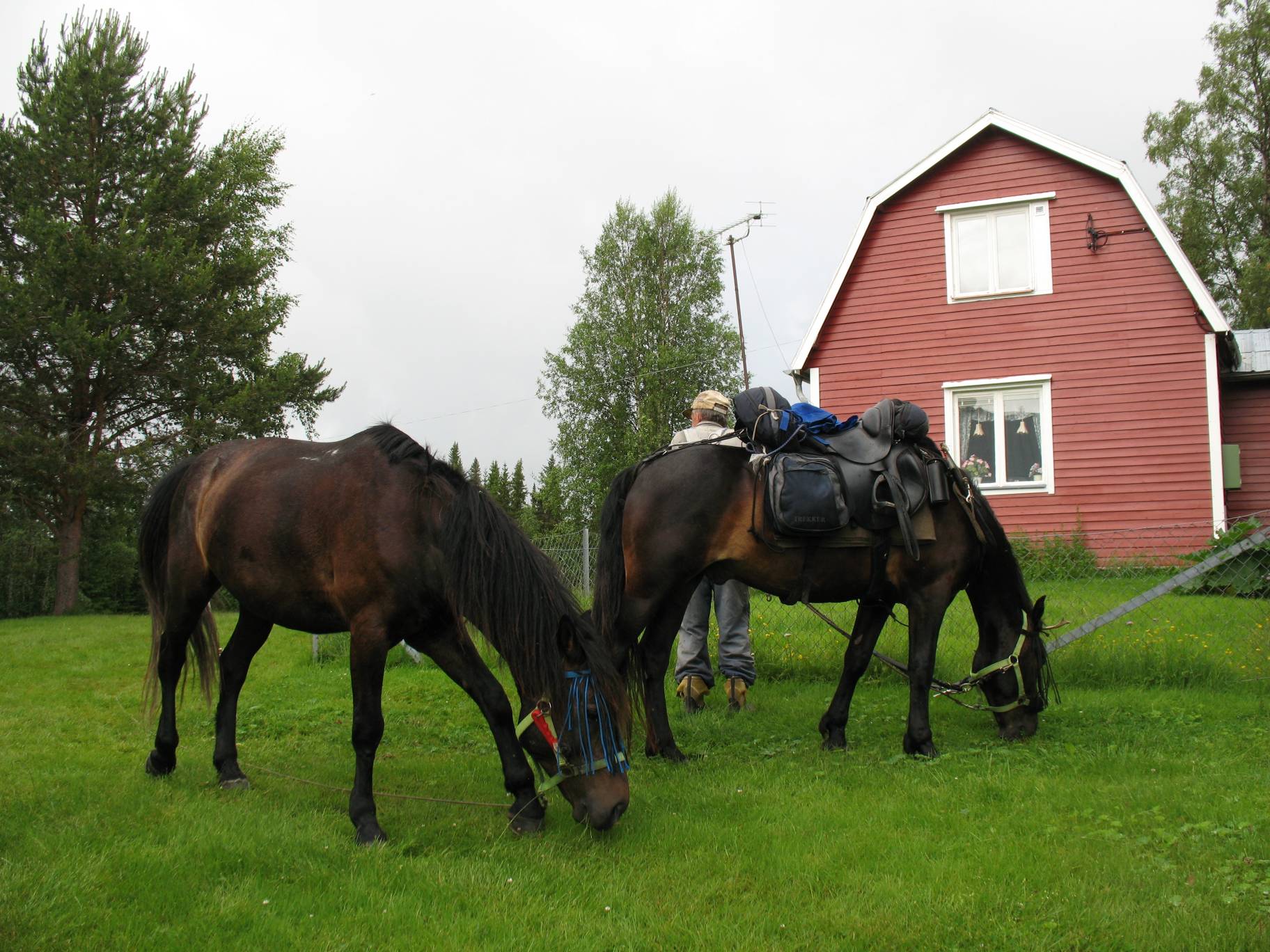 | (Left) Vaidotas at the Arctic Circle and (right) his horses and equipment. |