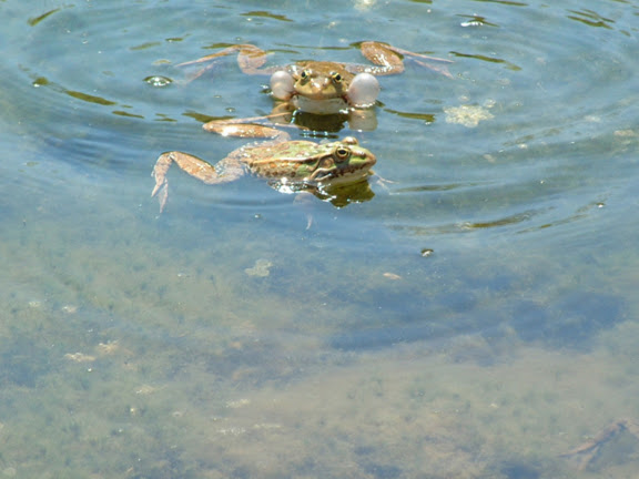 They were in full spring activity, so they didn't even notice me. At first I thought that this frenzy of activity was because the males were trying to attract females. What was actually going on was a man's thing. The males were floating on the surface absurdly blowing out their cheeks like bubble gum. That's how they make that daft noise. It is taken as a very serious challenge by other males. There is a lot of shoving and pushing. Frog women are not permitted much input. You see one gloomily swimming about with a suitor firmly clasped to her back. That's when the real fun starts if you are a male frog. What you have to do is knock the incumbent male frog off and take his place for as long as you can. Nobody asks her which she prefers. She probably doesn't like any of them much. Courting seems to be uncomfortable, if not actually hazardous for her.