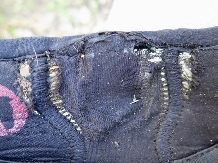 My first hoof boot. I made it while traveling across America with my mule Woody and pony Maggie. It consisted of duct tape wrapped around inner tubes. It held up well enough. I eventually switched to more conventional (ie: “store bought”) hoof boots.