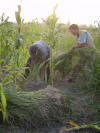 | Rosa and Korban beating the seeds of grass to feed the animals. |