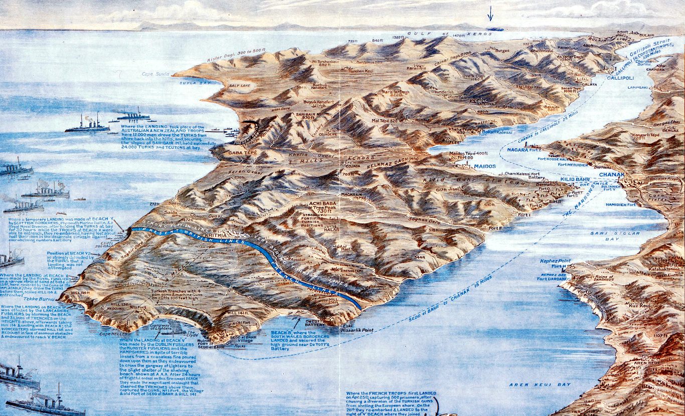 A map drawn in 1915 depicts the where the Ottoman and Allied forces fought on the Gallipoli Peninsula. First Lord of the British Admiralty, Winston Churchill, is quoted beneath the map. “Here is being fought what Mr. Churchill has well called ‘the last and finest crusade.” |