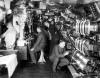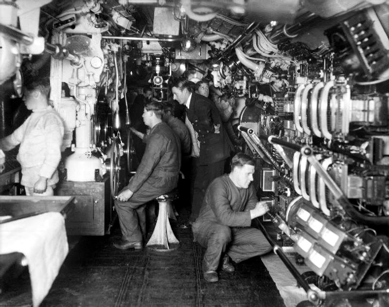 | Built with compartmentalisation and endurance not previously achievable, the E class were the best submarines in the Royal Navy at the start of the First World War. It had a total length of 176 feet (54 m) and a beam length of 22 feet 8.5 inches (6.922 m). The E class served with the Royal Navy throughout World War I as the backbone of the submarine fleet. Its complement was thirty-one crew members. This image shows the interior of an E Class submarine. |