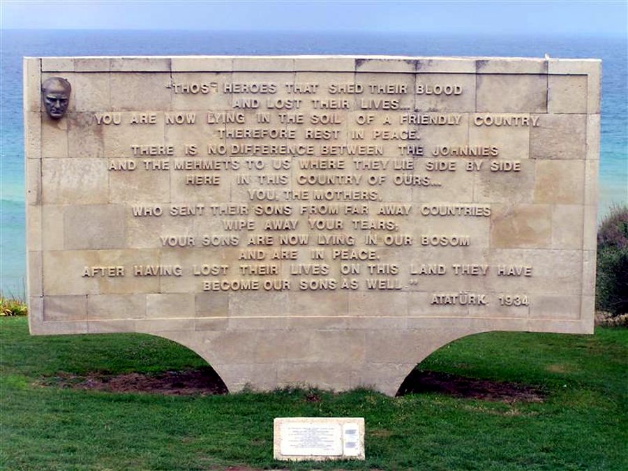 | In 1934 Turkish President Kemal Atatürk, who had fought during the Gallipoli campaign, dedicated this memorial to the 113,350 soldiers who had fallen on both sides during the bitter conflict. |