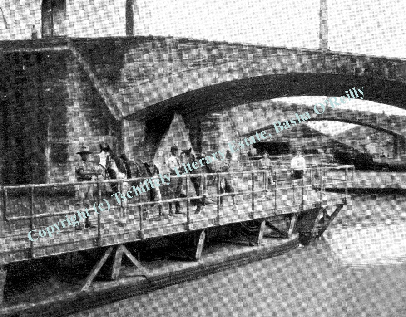 To cross the Panama Canal Tschiffely obtained the assistance of the American Canal Zone police, who took the horses through the famous waterway. They are seen transiting the Pedro Miguel lock. |