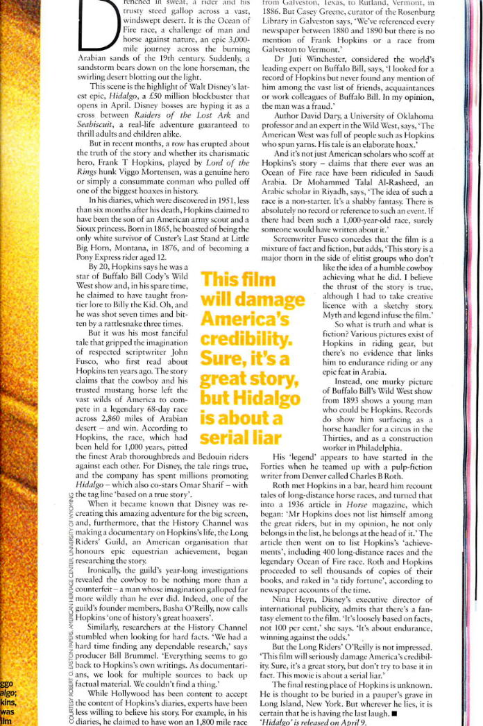 But in recent months, a row has erupted about the truth of the story and whether its charismatic hero, Frank T. Hopkins, played by Lord of the Rings hunk Viggo Mortensen, was a genuine hero or simply a consummate conman who pulled off one of the biggest hoaxes in history.