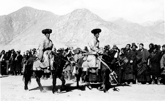 We were surprised and our horses startled by a sudden outburst of stirring military music from a brass band, the only band of occidental instruments in Tibet. Presumably the instruments had been taken from a Chinese army in 1911.